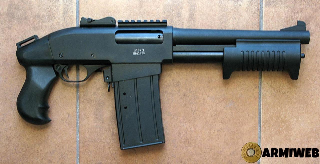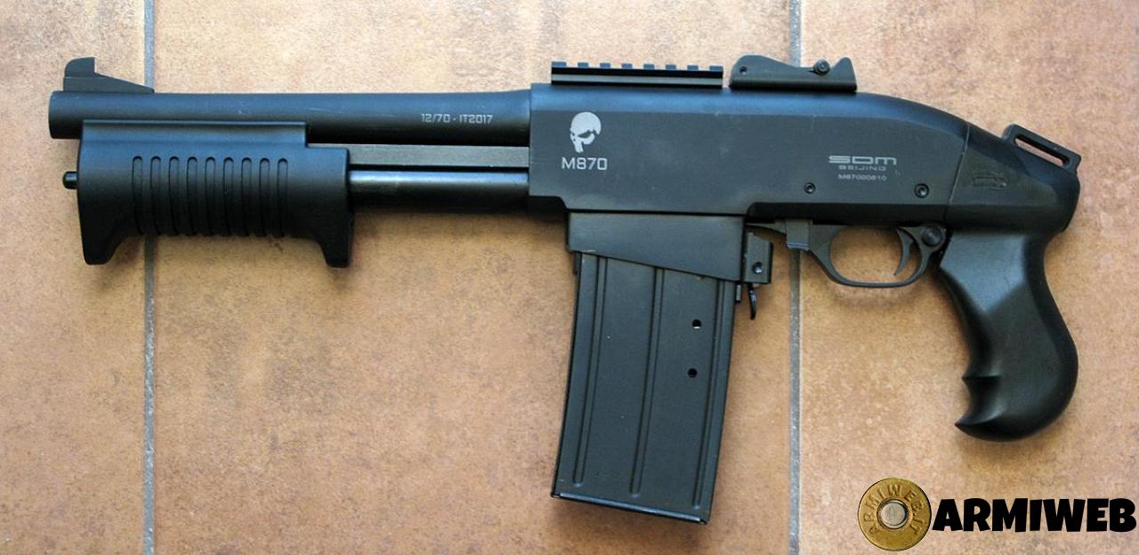 PISTOLA A POMPA SDM MOD. M870 CAL. 12/70, con caricatore a 5 colpi, tacca di mira regolabile. Lunghezza totale dell'arma 46,5 cm. Se usata con cartucce caricate a "sale e peperoncino" ha un basso rinculo ed è adattatta alla difesa abitativa perché non uccide l'aggressore e non si è invischiati nella "trappola" del nuovo codice di Legge sulla Difesa Personale. L'arma è nuova, non ha sparato un colpo.
